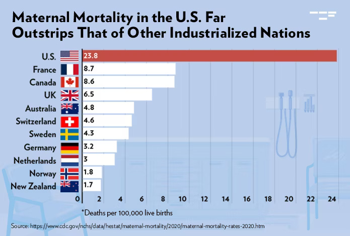 As an American, I find the chart above to be embarrassing and humiliating. And horrifyingly sad. Why isn’t this talked about with a determination to change it? Some Americans are obsessed with preventing abortions (women’s reproductive freedom). Where are those voices on this subject? Don’t moms and babies have a “right to life” after leaving the birthing room?
